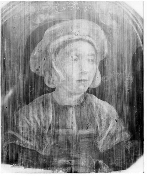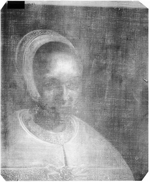 Editor: This is an X-radiograph of "Mrs. Chandler," by Winthrop Chandler. It's fascinating to see the painting stripped down like this! What can we learn about Chandler's process by looking at this image? Curator: This X-ray gives us insight into the artist's labor, revealing the materiality and construction of the painting itself. What do you notice about the density and layering of the paint? Editor: It looks like there are areas of thicker application, particularly around the head and shoulders. Curator: Exactly. This suggests Chandler's focus and perhaps areas of reworking or adjustments. It shifts our attention from the subject to the very act of making. This process gives a better idea of Chandler's work! Editor: I never thought about seeing the materiality of a painting like this. Curator: Right? It changes how we value the work.