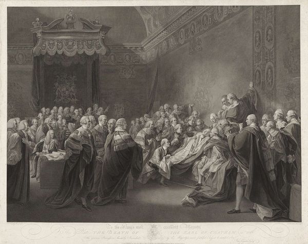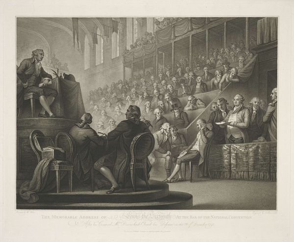 Editor: This engraving, entitled "Luther verdedigt zijn stellingen" (Luther Defending His Theses), likely created between 1822 and 1845, presents a scene brimming with figures, seemingly caught in mid-dialogue. I'm particularly drawn to the composition; it feels very staged, almost theatrical. What stands out to you as you examine the print? Curator: The theatricality you observe is germane to its effect. The use of light and shadow structures the composition, immediately drawing the eye to Luther himself. Notice how the engraver masterfully employed chiaroscuro, a strong contrast, not to merely depict but to highlight the dramatic tension of the moment. Note the texture created through the meticulous linework, which articulates form and depth. The historical costumes, while adding context, function also to denote social standing within the pictorial space. Editor: The high contrast is something I missed on the first pass, as the gray tone felt uniform. I guess that pulls the scene forward and increases that sense of dramatic tension. Is there significance to all the observers packed behind Luther? Curator: Consider how the artist utilizes spatial organization. The compressed figures behind Luther create a sense of depth, yet they also act as a compositional anchor, directing focus to the main figures in the foreground. The placement suggests a collective judgement, a silent pressure augmenting Luther's visual significance. Look closely at the interplay of vertical and horizontal lines created by the architectural details. Do they enhance or diminish the thematic strength? Editor: I now see that those background figures work as a wall. What I had considered to be a somewhat mundane illustrative work appears now as a meticulously assembled network of shapes and figures creating drama. I suppose, that after analyzing those details I’ll start to notice them everywhere else!