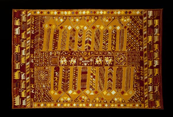 This textile panel, made by an anonymous creator, features a bold geometric design in red and white. The intricate pattern suggests painstaking work. Perhaps the maker employed techniques like block printing or resist dyeing to transfer the design onto the cloth. The evenness of the pattern across the panel speaks to precision and control in the execution of this piece. Consider what the materials themselves convey. The cloth, its texture, the way it drapes and falls, and the dyes used to create the pattern. These choices may reflect cultural traditions, local availability of materials, or perhaps the maker's personal preferences. The panel's creation likely involved specialized knowledge and skills passed down through generations. The value of this lies not just in its aesthetic appeal but also in the cultural heritage and social bonds embedded within its making. It reminds us that craft and fine art both come from human ingenuity and creative expression, and that both are important.