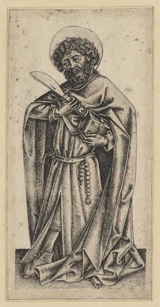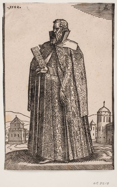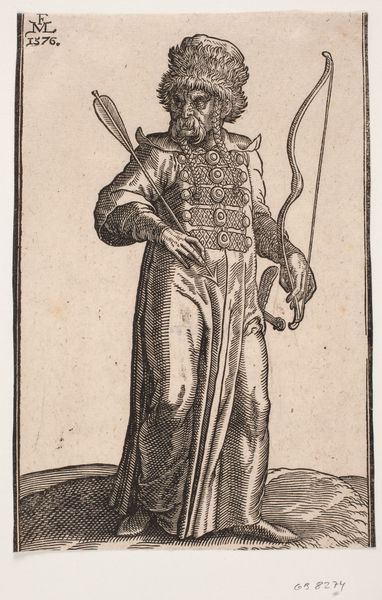 Curator: Let's turn our attention to this print, “Standing, cape-clad soldier, seen frontally” created by Melchior Lorck in 1576. It’s a woodcut, currently residing at the SMK in Copenhagen. Editor: He looks wearied, doesn’t he? The texture of his face—those deep lines— speak to a history worn visibly. And his grip, ever so slight on those brutal-looking weapons. Curator: Exactly! Lorck masterfully uses the woodcut medium to emphasize the weight of symbols, imbuing this soldier with cultural memory. Consider his attire – the feathered turban, the heavy cloak – each element alludes to a specific identity, now blurred with the passage of time. Editor: Identity is at the crux of this piece for me, too. The stance, presented "frontally" as the title indicates, appears as more a surrender than strength, no? The landscape is desolate; the crumbling tower behind him implies societal decline. Perhaps a critical commentary about militarism? Curator: That is a great perspective. Think also of his weaponry – the battle hammer and flanged mace – as not just instruments of war, but symbols of authority and, dare I say, brutality. These recurring symbols throughout history carry cultural baggage that shape our present. Editor: And how that power is displayed! Lorck's work acts as a reminder of whose histories get told, of how frequently marginalized figures get overlooked. Who did this soldier oppress, and who celebrated that power? Curator: Well, he has been described as standing. One can read the image also from a less contemporary perspective. This is also where Mannerism comes into play, a stylistic tension and dramatic flair that gives the work more narrative force. Editor: I do concede on that note – that flair works in visual shorthand to glamourize power – a dangerous and yet consistent artistic tendency worth discussing. Curator: Precisely, it provokes continued contemplation. What might be an entirely obvious icon in one epoch can grow opaque, even controversial, in the next. Editor: A poignant reminder of art’s power to engage and challenge us through centuries of socio-political change.