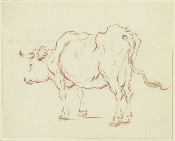 Editor: This drawing, "Standing Ox Facing Left, Seen From Behind in Slight Foreshortening," is by Friedrich Wilhelm Hirt, who lived in the 1700s, I believe. It's done in pencil and chalk. I find it so simple and straightforward, almost…stark. What stands out to you about it? Curator: Immediately, I'm drawn to the symbolic weight an ox carries across cultures. Think of its association with strength, labor, but also sacrifice in ancient rituals. Does the foreshortening suggest anything to you about our relationship to this animal – a distance, perhaps? Editor: Maybe… it's almost like we're meant to observe it working, or just existing in the field from afar. The averted gaze enhances that. I'm curious about your thoughts on animal representation then, and now? Curator: Yes, and in many mythologies, cattle were often associated with deities, fertility, or even the origin of the cosmos. Artists would study nature directly but infuse the natural form with symbolic weight. I would wager this isn't a photorealistic capture of a beast of burden but rather, one charged with cultural memory. Editor: It is interesting that such a simple drawing holds such powerful cultural baggage. The image feels incredibly direct, almost documentary, but your interpretations suggest there's so much more depth to it. Curator: Indeed. Think how pastoral landscapes themselves have functioned in art history to evoke nostalgia for a simpler life, or idealized notions of the natural world. And it all comes back to this ox. It serves as a constant visual symbol, reminding us that these landscapes and the animals represent specific belief systems. Editor: That is a point well taken. Thank you. I will reflect more on the connection between landscape and beliefs represented within. Curator: The pleasure was all mine.