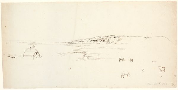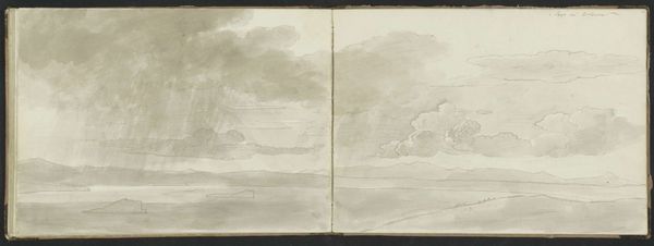 Curator: Agnes Slott-Møller created "To rids af dansk kystlandskab" or "Two Sketches of a Danish Coastal Landscape" in 1897. It seems to be a piece crafted with pencil, colored pencil, and watercolor. What's your first take? Editor: Immediately, I sense a quiet stillness, a kind of preliminary contemplation. It’s intimate, like peeking into the artist's personal reflections on the landscape, not meant for public display, but raw, more for the artist herself. Curator: I'm intrigued by that notion of intimacy given the very materiality of the sketch. These are commonplace materials accessible to many—paper, pencil, watercolor, and coloured pencil—elevated through the artist's skill and the unique viewpoint offered by the Danish coastal landscape. It emphasizes art making as a common labor or a starting point accessible for most. Editor: Absolutely. But looking deeper, the choice of rendering this coastal landscape in such an ephemeral, almost fleeting style could reflect the instability of land ownership or even the rights to common spaces. We are faced here with an ambiguous sense of accessibility. In the turn of the century, what were the artist’s personal ties to the coastal landscape and was her personal relationship to the site informed by socioeconomic barriers for the people, say fishermen, who work there every day? Curator: That’s interesting, framing this image within broader issues of access. But the very nature of sketching allows us to analyze her mark making as being of its time—and so she is participating in a visual conversation with her own place and time, perhaps inevitably also of her class. The sketch isn’t as “simple” as it appears to be when examined with its contemporary methods. Editor: Right. And that kind of class analysis must further ask questions regarding Slott-Møller’s unique identity, how the female gaze informs her choice of this intimate landscape scene, or how that can intersect with a male’s, particularly the male fisherman who faces a difficult career or his class consciousness tied with labor. Curator: Thinking about this coastal setting from a materials perspective, I also consider the availability of the medium here to convey landscape as the subject--the accessibility of water for water colors, paper created from wood—all coming directly from raw materials to enable the final, captured landscape scene. Editor: I agree that a material lens sharpens our perception here, and combined with those contextual layers we are unpacking, what at first glance looks like a quick, simple sketch becomes far more potent. Curator: It’s an excellent reminder that seemingly straightforward sketches are often fertile grounds for deeper exploration into making and representation. Editor: Indeed. This small work, with its unassuming qualities, prompts larger reflections on artistic intentions, social realities, and how art engages with broader struggles.