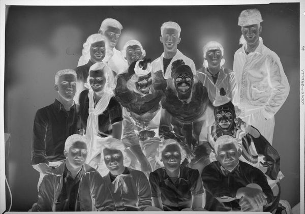 Curator: This silver gelatin print, "Untitled (women's basketball team group portrait)," comes to us from the Hamblin Studio. Editor: My initial reaction is that the composition, with its stark reversal of light and shadow, lends an almost spectral quality to these young women. Curator: Indeed, the photograph presents a fascinating study in contrasts. Note how the tonal inversions shift our perception of form and texture, almost abstracting the figures. The interplay between light and dark creates dynamic tension. Editor: I find it compelling how this image captures a moment in time when women's sports were gaining momentum, a testament to their growing presence in public life and institutional support in providing them facilities and teams. The inverted presentation adds a layer of complexity, suggesting a hidden narrative. Curator: Precisely. It makes you contemplate the essence of representation itself, doesn't it? Editor: Absolutely. It reminds us that photographs are not simply records but constructed images, carriers of historical weight.