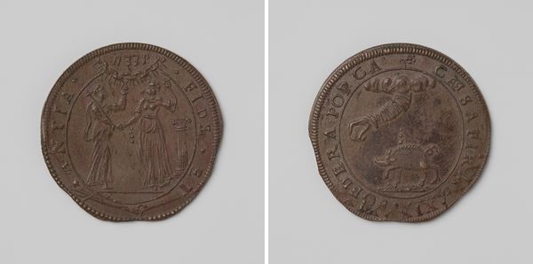 Curator: What an intriguing artifact! This is a representation of "The Act of Abjuration," a pivotal moment when the Dutch Republic declared its independence from Philip II of Spain. It's dated around 1583. Editor: It feels...heavy. Visually, of course, but there's something oppressive about that central image. Like history compressed into a dense, symbolic disc. Is it meant to be bronze? Curator: Quite possibly. Bronze or copper. The medal or coin-like format was very common for disseminating political messages at the time. See how the image depicts the severing of ties. On the left, we have a figure representing the Dutch provinces, while on the right is a female personification of Liberty or the Republic, standing triumphant over the lion, which, in this context, can be viewed as Spanish power. Editor: So, a divorce visualized. The figures are rather stiff, but that gesture of severing – almost handing off the power, if you will – is striking. But who's actually designed this propaganda tool? Is it pure imagination, or is it based on other illustrations of the day? Curator: It is the work of Gerard van Bylaer. While its source inspiration isn't explicitly documented, Bylaer may have relied on a blend of imagination and contemporary depictions. His aim, of course, would be to project a powerful vision of the newly independent Dutch Republic. Consider, this object exists within a historical landscape saturated with political and religious strife, it has a powerful statement for popular consuption. Editor: I can’t help but see echoes of more ancient motifs here too. This "handing over" has precedents in other medals, say ones showcasing imperial triumph, which makes the message quite subtle; it reclaims old symbolism for a novel purpose. Curator: Absolutely! That's the fascinating dance of history – reusing symbols, repurposing narratives. This object acts as a fascinating intersection. Its creation clearly indicates how images have been actively deployed to influence and shape perception, as instruments for political legitimization. Editor: This gives me the sense of weight and resolve, a visual embodiment of a people willing themselves into existence. It's quite moving when you think of it in those terms, and quite unsettling how relevant this all still seems. Curator: Indeed. Gazing at this representation reminds me that revolutions don't only unfold on the battlefield or in courtrooms, but also in the collective imagination, fueled by symbols like these, that become the cultural touchstones of self-determination.