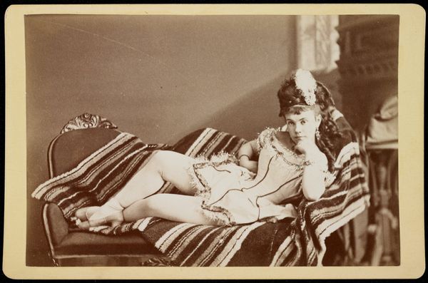 Editor: This is a photograph, "Margaret Frances Langton Clarke," taken by Lewis Carroll sometime between 1864 and 1866. The light is just beautiful. She looks kind of sad though. What strikes you about this photograph? Curator: Notice the materiality. It’s not just a picture of a girl, but evidence of a complex production. Consider the cotton used for her patterned dress versus the plush, probably more expensive fabric of the chair. Who had access to these commodities and under what labor conditions were they produced? Editor: That's interesting! I was so focused on her expression, I didn't really think about the actual making of the photograph or the clothes themselves. Curator: Exactly! Look closely. The backdrop is another textile, probably draped. How does that pattern clash, or perhaps harmonize, with the girl's dress? Is it intentional or simply what was available? Then there's the chair - upholstered furniture speaks volumes about the sitter's family wealth and position. The photograph is evidence of so many stages of materials. Editor: So you're saying that the materials themselves are telling a story about Victorian society? Curator: Absolutely. Think about Carroll’s role in all this, as a relatively privileged photographer documenting members of his social circles. The choice of clothing, props, even the backdrop all become tools used by Carroll in crafting a particular image for this photographic print. Editor: I never really thought of it that way! It's like the materials are co-authors. I see this image so differently now. Curator: Right? Each choice reflects material availability, labor, class structures... Photography is never just about "capturing reality." We can examine the processes required to realize that photographic effect! Editor: That definitely adds a layer I had not considered. Looking at the material of the chair now is telling of how things made impact social circles, it’s almost a critique. Thanks!