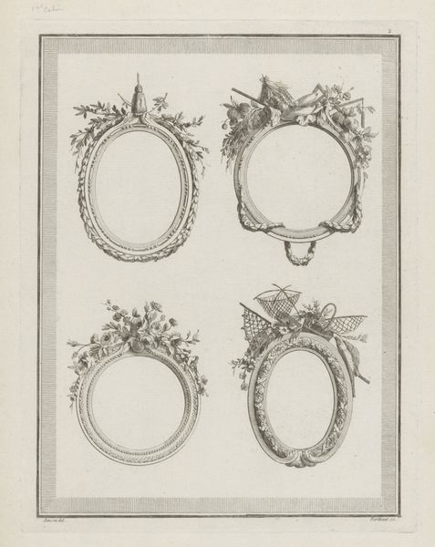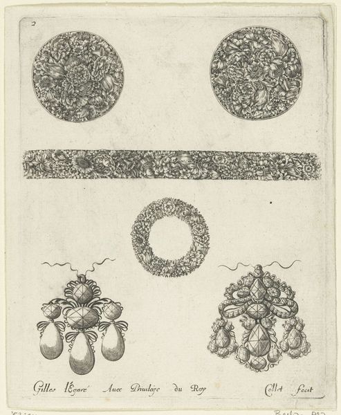 Editor: We're looking at "Vijf Juwelen" by Carl Friedrich Bärthel, a watercolor and ink drawing on paper from around 1800-1810. The image depicts five separate jewellery designs on a single sheet, each a delicate arrangement of gems, presumably diamonds, set in gold. The designs feel very balanced, but restrained; what do you see in the composition of this piece? Curator: The distribution of the forms within the plane is very compelling. Note the variation in shape – the circles, the serpentine line – and how each uses the arc of the mounting as a compositional element. It directs our gaze back to the concentrated area of gems and implies a completion, a satisfying resolution. Consider also how the white space around each form isolates them, enhancing the sense of individual preciousness. What purpose does the artist want to serve by using paper? Editor: Well, the medium does feel important, it heightens the delicacy of the presentation. It really enhances the perception of these as miniature objects. Perhaps the artist chose these materials for that specific quality. But if it's not a photograph and they are designs for jewellery, wouldn't they be using metal? Why opt for watercolor if metal seems the obvious option? Curator: Precisely! By using a more fragile, ephemeral medium like watercolour, Bärthel draws our attention to the very act of representation. He is showing the creative, conceptual stage. Think about the translucency of watercolor itself, it imitates the shimmer of the gems. So we're seeing a layering of materials: gold suggested by yellow pigment, diamonds by the glittering effect of watercolour. The material engages us with illusion. Editor: So it's not just about rendering, but also about revealing the process of envisioning beauty through carefully selected media. I understand what you mean; it really makes me reconsider what this piece communicates. Curator: Indeed. Paying close attention to form, material, and presentation can uncover new meaning, revealing the intentionality of the artist and how that manifests as concepts.