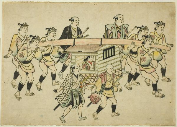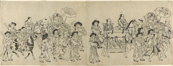 Hishikawa Moronobu created this woodblock print titled "Korean Embassy Parade" during the Edo period in Japan. The work depicts a procession, offering insights into the socio-political dynamics between Korea and Japan at the time. Such parades served a public function, communicating the status of international relations to the Japanese populace. The image creates meaning through visual codes, cultural references, and historical associations. The attire, modes of transportation, and arrangement of figures reflect the strict social hierarchies of both cultures. Given Japan's evolving foreign policy during the Edo period, especially concerning its relationship with Korea, prints like this become significant historical documents. It’s worth asking: was this art used to promote a certain political viewpoint? As historians, we consider such prints within their contemporary social and institutional contexts, drawing on diplomatic records, costume studies, and analyses of popular culture to understand them better.