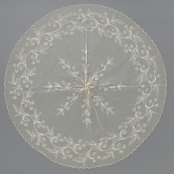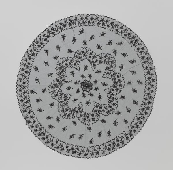 Editor: Here we have a "Parasol Cover of black gauze with eight woven leaf branches with berries and a border of large flowers and leaves," dating from around 1875 to 1900. It’s weaving, a textile object from the Rijksmuseum. What strikes me immediately is its almost mesmerizing level of detail. Curator, how do you see this piece within its historical context? Curator: It's interesting to consider this parasol cover within the context of the late 19th century. Remember that this was a time when sumptuary laws had largely disappeared. A burgeoning middle class now had aspirations, access, and buying power to the previously exclusive markers of aristocracy, and black gauze in particular held specific cultural weight. What might possessing this object have signaled socially to the user and her observers? Editor: Status? An aspiration to that high-society, perhaps? Did the black gauze symbolize mourning during that era? Curator: Precisely! Black fabrics could denote status and, you're right, mourning was heavily codified. However, the bright floral design complicates a straightforward interpretation of mourning. Consider the intense ornamentation and natural motifs. What do they tell us about the intended audience and their desires? Does this relate to ‘high art’ in any way? Editor: I see that! Maybe the flowers are celebrating a transition, a renewal of life instead of mourning? To me, it has decorative charm rather than fine art, it’s applied art meant to be functional. Now I see why it falls into the pattern-and-decoration movement, it does seem like the democratization of owning ornamentations. Curator: Indeed! It reflects a societal shift in access to decorative objects and also, the breaking of hierarchies between art and craft. That makes you consider this differently, doesn’t it? Editor: Definitely! Thank you!