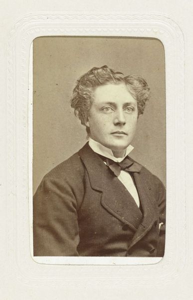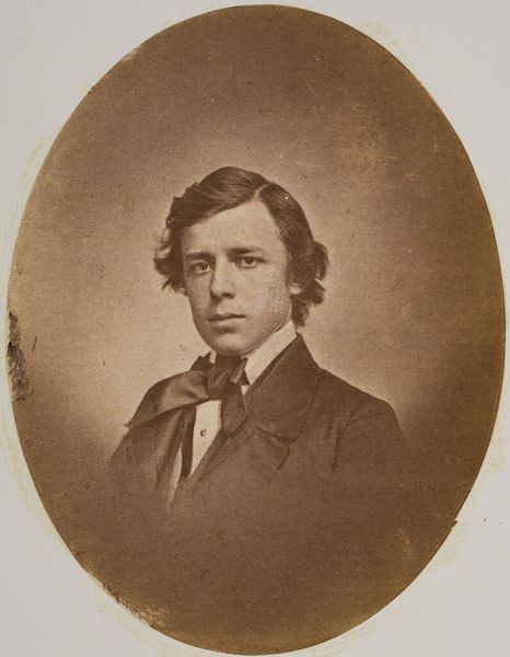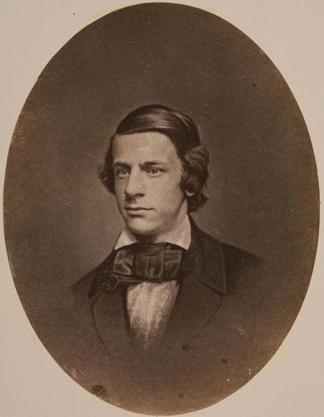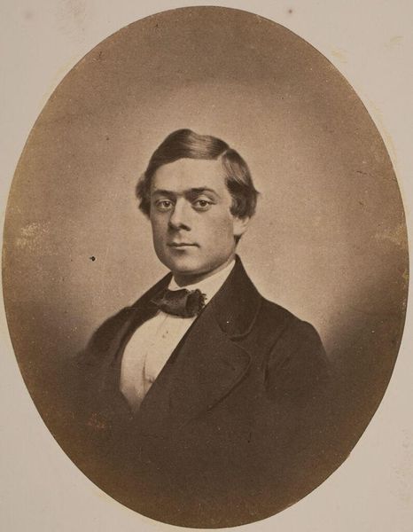 Curator: This daguerreotype, held at the Harvard Art Museums, is by John Adams Whipple, active in the mid-19th century, and presents an unknown sitter. Editor: The oval format creates a sense of intimacy, doesn't it? Almost like peering through time. Curator: Exactly. Daguerreotypes, with their mirror-like surfaces, were often cherished as precious keepsakes, capturing a specific moment and identity. The man's bow tie and jacket suggest a formal occasion. Editor: But there's a certain vulnerability in his gaze, amplified by the soft focus. It disrupts any sense of aloofness associated with formal portraiture. Curator: Perhaps it reflects the sitter's awareness of being captured by this new technology, a technology that forever altered our relationship with memory and self-representation. Editor: Yes, the sitter is self-conscious, but also participates in constructing a specific image that is meant to outlive him. Curator: It’s a powerful, if silent, dialogue across the ages.