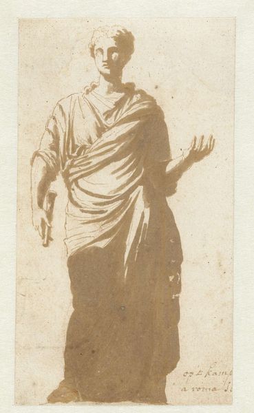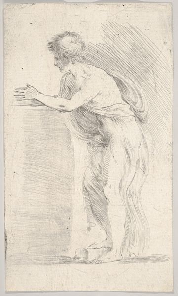 C.A. Lorentzen captured this drawing of a seated model in drapery in muted tones, likely towards the end of the 18th century, using a monochrome palette. The composition is structured around the interplay between the organic form of the human body and the geometric plinths. Notice how the soft, flowing lines of the drapery contrast with the sharp edges of the plinths, creating a visual rhythm that guides the eye. The model's pose, with his arm resting on the higher plinth, introduces a diagonal element that adds dynamism to the otherwise static scene. The use of light and shadow is particularly striking, employed to define the contours of the figure and drapery, giving them a three-dimensional presence on the flat surface. This chiaroscuro effect not only enhances the realism but also imbues the scene with a sense of gravity and contemplation. The subtle gradations of tone, achieved through delicate hatching and cross-hatching, reveal the artist's mastery of the medium. The drawing exemplifies how formal elements converge to articulate space and volume.