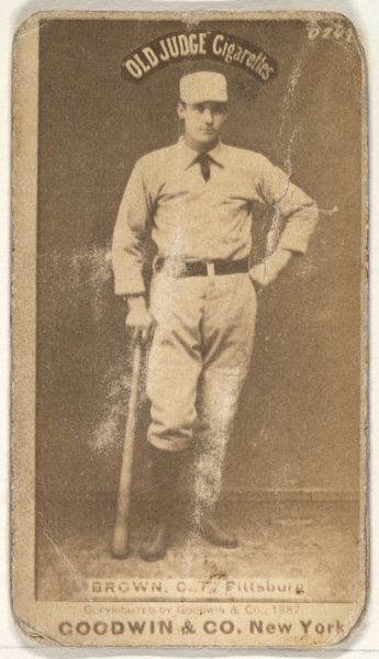 Editor: This is a fascinating piece from 1887, "Glasscock, Shortstop, Indianapolis," part of the "Old Judge" series by Goodwin & Company. It's a gelatin-silver print, so almost like a very early baseball card. There's a real sense of formality, even nostalgia about it. What strikes you about this image? Curator: The weight of symbolism here is compelling. Beyond baseball, what is this image trying to tell us? He stands rigid, in his uniform, against that blurry backdrop. The Old Judge Cigarettes banner is so prominent. Editor: What do you mean, 'weight of symbolism'? Curator: Images become imbued with meaning, layered over time. Look at the crispness of the figure, the deliberate pose with the bat. Baseball itself was becoming increasingly codified as the national pastime around this time, taking on connotations of American identity and virtue. He's not just a player; he is meant to embody the qualities valued within that concept. Editor: So the cigarette advertisement adds to that meaning somehow? Curator: Precisely. This image sold cigarettes, but it also linked the ideas of health, vigor, and athleticism with this new, increasingly popular form of recreation. This photo helped cultivate cultural values regarding ideal masculine archetypes of the era, through consumption and athleticism. Do you see the commercial underpinnings normalizing habits that later may be considered questionable in sports sponsorships? Editor: I see that connection now! It makes me wonder how the symbols we associate with athletes today will be viewed in the future. Curator: It is always worthwhile considering what cultural baggage each image accumulates, for that may also reveal blind spots, normalized values we might wish to scrutinize, or continuity within cultural memory.