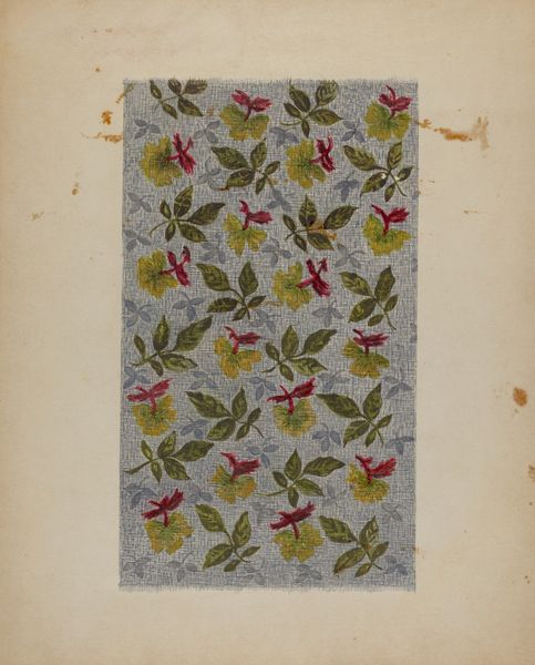 Grace Halpin made this small study, *Calico,* with watercolor and graphite. Isn’t it something? She’s laid down these little flowers over a kind of blue-grey fabric. I’m really drawn to the way she used a limited palette to create a sense of depth and texture. You can really sense the careful process of building up layers of color. It's like each flower is a little world, with so many layers of meaning. The marks are delicate and precise, yet there’s a kind of looseness. The petals are soft and blurry, while the leaves are drawn with sharp, decisive lines. And look how the flowers are anchored by those dark, arching lines. They're like tiny question marks. Are they stems, handles, or just abstract forms? Thinking about Halpin’s contemporary, Hilma af Klint, I see a similar interest in abstract forms combined with naturalistic elements, suggesting an ongoing dialogue about the possibilities of representation. For me, this piece is really about how much can be said with just a few simple marks.