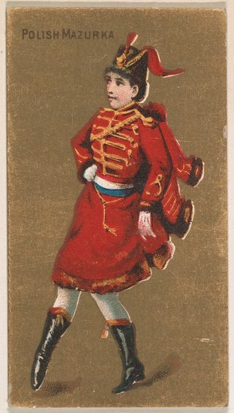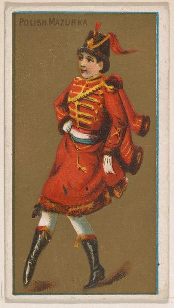 This is a chromolithograph titled Polish Mazurka, from National Dances, created around the late 19th century by Kinney Brothers Tobacco Company. The small print presents a figure adorned in Polish national dress, set against a muted backdrop, which immediately draws our attention to the detailed costume. The eye is guided by the strategic use of color and line: gold detailing against a vibrant red coat, with a high contrast between the black boots and white stockings, adding depth and rhythm to the composition. The figure is captured mid-motion with great attention to posture, encapsulating the liveliness of the Mazurka dance. Consider how the image, though commercial, also functions as a cultural signifier. It's a semiotic representation of Polish identity, packaged for consumption, which flattens and exoticizes cultural expression into a singular image. It highlights the power of representation and how images, even those seemingly innocuous, actively participate in constructing and disseminating cultural narratives.