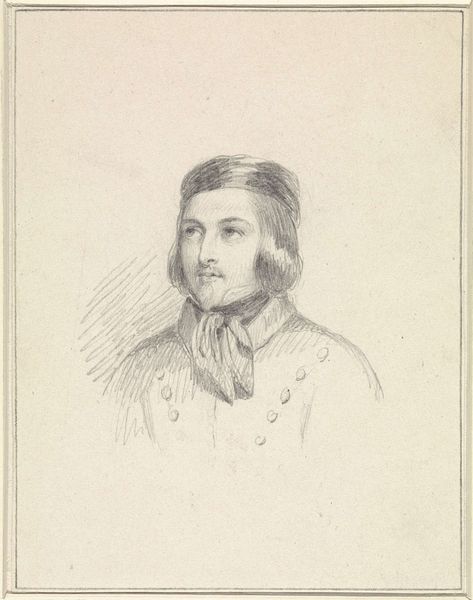 Karl Sandhaas made this bust portrait of the painter Adam Eberle from Düsseldorf using pencil on paper. The drawing presents a study in understated elegance, where the artist's skill is evident in the delicate handling of line and form. Sandhaas masterfully uses the pencil to define Eberle's features, capturing a sense of quiet introspection. The composition is carefully balanced, with the subject's gaze directed off to the side, creating a dynamic tension within the frame. The texture of the paper adds a tactile quality to the drawing, enhancing its intimacy. In this work, Sandhaas challenges conventional portraiture by focusing on the essential elements of form and expression. The lack of superfluous detail allows us to engage with the subject on a deeper level, inviting contemplation on the nature of identity and representation. It encourages us to explore the subtle nuances of line and texture, appreciating the artwork as a site of ongoing interpretation and re-interpretation.