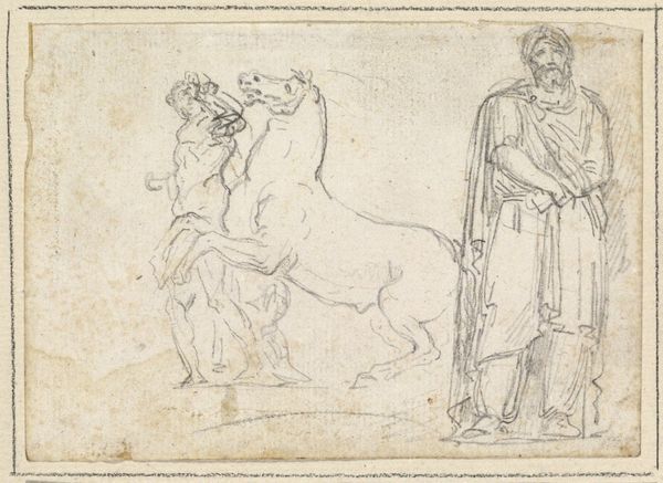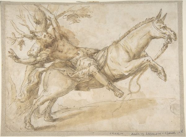 Editor: This drawing, "The Rape of Europa" by Giulio Romano, captures a moment of dramatic tension. What symbols do you see at play here? Curator: Notice how the bull, typically a symbol of virility and power, is subverted by the presence of Europa, whose flowing drapery hints at both vulnerability and agency. Does her expression suggest fear, or perhaps a more complex negotiation of power? Editor: I hadn't considered that. It's more nuanced than I initially perceived. Curator: Indeed, Romano masterfully employs visual language to evoke layers of meaning, prompting us to consider the enduring cultural implications of this classical myth. Editor: That is an interesting detail to keep in mind. Thanks for your expertise. Curator: My pleasure. It's fascinating how images continue to resonate through time.