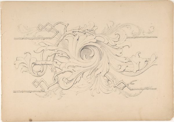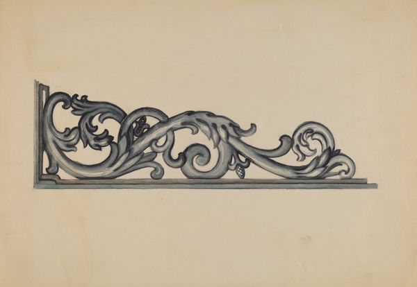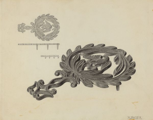 Curator: We’re looking at “Flat Iron Holder,” a drawing dating to around 1938, by Jack Staloff. It's rendered in graphite on paper. Editor: It's gorgeous! Such ornate detail for something so...domestic. It's got this antique quality, like something unearthed from a Victorian parlor. Almost gothic with those swirling flourishes. Curator: The geometric structure underlying the decorative details is fascinating. Staloff seems preoccupied with revealing its planar surfaces through the tonal gradations. Editor: Right? It’s almost aggressively ornate, a far cry from minimalist. There’s a certain boldness, almost brashness in it's commitment to detail. Like saying, "Even the mundane can be beautiful." Curator: Precisely. The work engages with questions of functionality versus aesthetics. We see that tension embodied in this utilitarian object transformed into something…artful. The inclusion of the scale reinforces the sense of design as art, elevating an otherwise unremarkable artifact. Editor: I can practically smell the wood smoke from the iron and starch on freshly pressed linen! Does that make sense? It evokes such a strong sensory experience beyond the purely visual. There’s a warmth there despite the almost metallic feel. I suppose the graphite gives it that…weight. Curator: That warmth comes from its commitment to decorative art traditions, where beauty is accessible and integrated into the domestic sphere. We can trace that intention from the material--paper--up to the drawing technique, wherein form and utility coincide. Editor: Well, it definitely elevates my appreciation of something as quotidian as a flat iron holder. Makes you wonder about all the forgotten crafts people imbuing everyday objects with so much creativity. Curator: Indeed. By looking at this work by Staloff, we find something precious. It causes one to ponder form and function. Editor: Agreed! Now I'm itching to explore the intersection of design, utility, and art, armed with a whole new way to see the everyday!