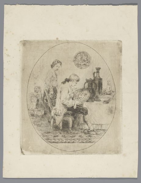 Curator: What strikes me first is how intimate this feels, almost like a stolen glimpse into a private world. Editor: Indeed. Here we have a pen and ink sketch titled "Blad met manier waarop vrouwen rusten en een manier waarop heren muziek maken" by Bernard Picart, dating back to around 1710. Currently, it resides in the Rijksmuseum. The composition is clearly divided into two registers, or scenes. The upper portion portrays two women and the lower, two men making music. Curator: Precisely, it’s the juxtaposition of the two scenes that piques my interest. Above, the women recline, one seemingly collapsing onto the other, a posture suggesting exhaustion or perhaps vulnerability. Below, we find a rather stiff formality in the musicians. I detect a commentary on gender roles and expectations, even. Editor: One might read it that way. But consider the compositional balance: the draped fabrics and swirling lines above mirror the ornate details in the men's garments and the musical instruments below. Picart seems to revel in texture and form regardless of the scene's ostensible subject. The linearity throughout is pronounced, contributing to its elegant austerity. Note the negative space – critical to the dynamic. Curator: But is that austerity perhaps deceiving? Note the instruments they are using – the gestures they are employing; do they symbolize a deeper, more emotional language lost to time, now only hinted at by the way they are presented? What does this artwork tell us about courtship, perhaps? Editor: Perhaps! However, from a structural perspective, the contrast emphasizes the carefully constructed arrangement of lines, shading, and figures within each register, demonstrating a clear aesthetic preference regardless of potential symbolism. Curator: I concede that. Still, for me, the image serves as a melancholic reflection on bygone social dynamics. The sketch seems steeped in ritual. Editor: And for me, it is a demonstration of skill; its deliberate formal economy is simply compelling.