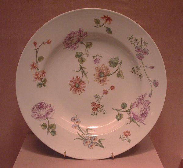 Editor: Here we have a "Plate" made of earthenware with watercolor painting by Joseph A. Hannong, circa 1760 to 1780. The delicate floral design almost gives it a sense of restrained joy. How do you interpret its formal qualities? Curator: Observe the interplay between the central floral motif and the plate’s scalloped edge. The artist uses asymmetry to create visual interest, contrasting the organic form of the flowers with the geometric regularity of the plate itself. Note how the watercolor medium lends itself to delicate gradations of color, highlighting the subtleties of each petal and leaf. The washes of color appear fluid, contrasting with the plate's hard surface. What is the effect? Editor: It seems to create depth and a soft, almost dreamlike quality, making the flowers appear to float on the surface. Does the placement of the flowers have significance? Curator: Precisely. The carefully considered placement draws the eye, encouraging us to trace the lines and shapes that constitute the whole. Ask yourself: what semiotic meaning does this arrangement convey? The use of negative space, where the white of the earthenware peeks through, enhances the lightness of the composition. Do you agree that this lightness contrasts with the heavier border of the plate? Editor: Yes, it frames the delicate flowers, highlighting the detail of the painting. It's interesting how the plate's structure itself contributes to the artwork's aesthetic value. I never considered a plate having such formal artistic qualities. Curator: Indeed. It's a successful unification of form and decoration, speaking to the refined aesthetic sensibilities of the Rococo period. Close examination reveals how even functional objects can operate as sophisticated aesthetic statements. Editor: Thank you. Looking at it now, I see more than just a pretty plate, but rather an artwork.