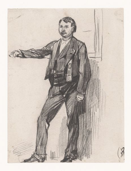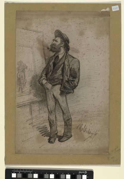 Marcellin Desboutin created this drypoint etching, "Portrait of Edgar Degas, wearing a hat", sometime in the late 19th century. Notice the figure's placement within a rectangular boundary. Desboutin skillfully uses etching to give the figure form and depth using just the pressure of line. Observe how the composition invites our reading. The figure of Degas stands almost like an imprint, rendered in delicate lines that capture his posture and attire. The slight diagonal tilt of his hat mirrors the angle of his body, creating a subtle, dynamic tension. The choice of drypoint etching as a medium contributes to the work's intimate feel; the fine, almost fragile lines lend a sense of immediacy and impermanence. Consider how Desboutin’s lines engage with absence and presence, suggesting a figure caught between visibility and invisibility. This approach is a commentary on the nature of portraiture itself, questioning what it means to capture an individual's likeness. As you reflect on this print, consider how its formal qualities not only define the image of Degas but also prompt a deeper inquiry into the art of representation.
