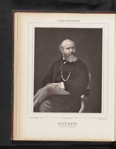 Curator: Here we have an albumen print dating to before 1876 by Mulnier, titled "Portrait of Charles Gounod." The photograph is presented within an ornate border, fixed within an album. What are your first thoughts? Editor: My initial impression is one of formal reserve, even with that intriguing sideways glance. The textures are also captivating – from the soft focus on his face to the sharply rendered detail in his beard and the intricate patterned mount surrounding the image. Curator: That sideways glance is certainly thought-provoking. It directs our attention beyond the immediate frame. Gounod, the famed composer, is positioned almost as if he’s contemplating his legacy or perhaps listening for an elusive melody only he can perceive. The formal composition underscores the societal expectations placed upon prominent figures of the time, but his expression hints at inner turmoil. Editor: I see what you mean. There's a real tension created by that contrapposto pose and the almost theatrical lighting. It's very painterly, almost echoing the Dutch Masters. The formal suit acts like a visual anchor, but his gaze really fights against the rigidity. Curator: Absolutely. And it brings to mind how portraits of this era sought to solidify one’s social standing and contribute to their lasting representation. The meticulous detail, achievable through photography at the time, replaced the laborious and expensive process of painted portraiture. Photography allowed a democratization of the image, where likenesses were attainable, though no less staged. Editor: True, and there's an intriguing level of craft here. From the silver salts reacting to light to the artist’s compositional decisions, it speaks to a particular moment of technological and artistic possibility. It's hard not to feel the weight of the past when looking at the photograph. Curator: Indeed, a tangible record of a man and a moment. It invites reflection on time, celebrity, and the visual languages we use to create and interpret our identities across generations. Editor: Agreed, it’s remarkable how this image preserves and projects not just Gounod’s likeness, but echoes of a whole era's visual and social sensibilities.