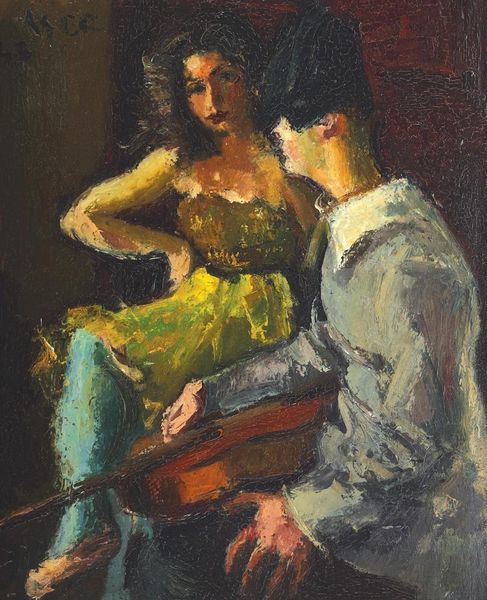 Editor: Here we have Ilya Repin's 1914 oil painting, "Portrait of poet, prose writer, translator and dramatist Sergei Mitrofanovich Gorodetsky with his wife." It has a distinctly romantic mood, but there is something unsettled about the woman's expression. How do you interpret this work? Curator: That unsettled feeling is palpable, isn’t it? Let’s consider the date – 1914. On the cusp of immense social upheaval with the start of WWI, this portrait can be read as symptomatic of the anxiety permeating intellectual circles at the time. Gorodetsky was part of the Guild of Poets. Do you know what their central tenets were? Editor: I’m not familiar, no. Curator: They aimed to move away from symbolism and toward clarity and realism in poetry, and also embraced an idealization of beauty. Now, consider the pose, the luxurious fabrics, the ornamental setting - Repin captures that yearning for beauty and permanence, but the unsettled gazes suggest a fragility. Look at her hand, seemingly holding… nothing? Editor: Yes, that’s so strange. It feels like she’s reaching for something just out of grasp. Curator: Exactly! And Gorodetsky seems almost ghostlike, a looming presence rather than an equal partner. To me, this reflects the precarious position of the intelligentsia - aware of impending social changes yet clinging to established artistic and social ideals. What do you make of the contrast in how they are painted? Editor: That makes a lot of sense. It highlights their different roles. He is obscured and somber, while she seems to embody that fragile beauty you mentioned, a last vestige of a disappearing world. I initially only saw romanticism, but the historical context really reveals a deeper complexity. Curator: Absolutely! It is a visual manifestation of the anxieties around identity, culture and the impending sense of change during a pivotal moment in history. It really goes to show the important tension between private lives and seismic shifts in power dynamics.