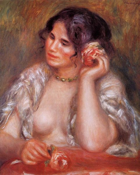 Curator: Looking at Renoir's "Woman with a Necklace," created around 1910, you get this instant feeling of serene intimacy. The canvas holds a portrait, oils on canvas I think, of a woman almost caught in a private moment, don't you think? Editor: Absolutely. Immediately, what strikes me is the passivity that’s portrayed; a stillness that reinforces this societal expectation of women occupying this space of docile beauty. Curator: See, that's interesting, I felt differently about the “docile beauty” - while the pose and subject are certainly beautiful, I’d actually read that expression as more self-possessed, self-contained. What do you think that says about beauty standards across movements like Impressionism or Post-Impressionism? Editor: The brushstrokes, the hazy edges, even the softness of the palette, seem to intentionally gloss over individuality. Consider the male gaze, the way women were largely positioned in these artworks—often nameless, reduced to ornamental roles. This artistic era perpetuated certain hegemonies by framing women primarily in relation to beauty. The woman's relationship with the jewelry takes prominence. The light draws attention to that as much as her face or expression, suggesting her connection to social values as she presents herself to be adorned in finery. Curator: Maybe...but doesn’t Renoir offer something a bit more intimate? To me, her expression looks pensive, rather introspective. It is a private moment for contemplation of self-worth through jewelry, not an overt display for external valuation from, say, an elite society? I sense something beyond simple ornamentation, you know? Maybe there’s an inherent defiance in being your own masterpiece for your viewing and assessment? The pearls aren’t loud. The colors, in their own quiet way, are very powerful. It's that post-impressionistic dream, I tell you. Editor: Perhaps… the context certainly complicates a straightforward interpretation. It requires grappling with what hasn’t changed, along with new emergent ways of representation and subjectivity. What do you think that the contemporary audiences can take from an engagement with a piece like this, then? Curator: For the viewer today, “Woman with a Necklace” presents an invitation. One that compels one to acknowledge a very deep history, a loaded context; whilst at the same time appreciating the subtle ways the art expresses itself through, in my opinion, inner strength in the artist's creation and subject. It feels so contemporary when I let go of old judgments. Editor: A balance, then. The painting encourages us to recognize past structures whilst inviting us to build our more progressive critical perspectives as active participants. That is something, at least.
