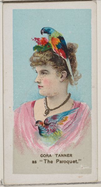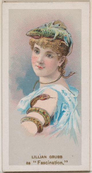 Curator: This delicate piece is entitled "Belle Urquhart in ancient Jewish costume, Island of Ceylon," dating from 1888-1889. It was created by W. Duke, Sons & Co. as part of a series for Duke brand cigarettes, and is currently held in the collection of the Metropolitan Museum of Art. Editor: My first impression is how this tiny portrait manages to feel so exotic yet strangely intimate, like a window into a meticulously staged play. Curator: Indeed! The combination of watercolour, colored pencil and printmaking points to the means of mass production. The company used relatively cheap materials, intending to make these images widely available in cigarette packs, turning them into collectible items, boosting consumption of their brand. Editor: Yet the turban and jewelry signal something more than mere commerce. The headdress particularly intrigues me. It’s not conventionally “Jewish,” hinting instead at a syncretic blend of cultures, reflecting perhaps a Western fascination with the “Orient,” all filtered through a very specific, colonial lens of the Island of Ceylon. Curator: You touch on something key: orientalism as a lens, presenting a romanticized view of non-Western cultures for Western consumption. Editor: And consider the layering of meanings here: Urquhart is styled in 'ancient Jewish costume', but for a contemporary Western audience. What are we meant to infer about her identity, about Jewish identity, about the exotic “other”? It prompts reflection on historical depictions of otherness. The layering is key here. Curator: And further complicated by its intended function: tobacco advertising, designed for mass consumption. There's tension between the artistic rendering and commercial purpose; both intertwined and feeding one another. The means of disseminating these images really impact meaning making! Editor: Ultimately, the symbols within the artwork create a dialogue between perceived identities and genuine representation, a dance between exoticism and familiar understanding that continues to echo into our own era. Curator: Examining this piece illuminates how mass production played an important role in constructing and circulating those perceptions about culture, identity, and "otherness." Fascinating.
