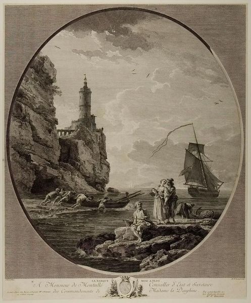 Curator: James Davis's "Sunrise," housed here at the Harvard Art Museums, presents a serene coastal scene. Its monochromatic palette and delicate rendering evoke a sense of quiet contemplation. Editor: Quiet maybe, but also a bit melancholic. The figures on the cliff seem isolated, dwarfed by the vastness of the sea and sky. It speaks to the romantic era's fascination with nature's power and the individual's insignificance. Curator: The scene is framed almost like a vignette, drawing the eye towards the light breaking through the clouds. One can also sense the symbolic potential of the sunrise—a motif of renewal and hope. Editor: Yet, the overall tone feels more like a lament. This could be a statement about humanity's relationship to the environment. Curator: I see your point. Perhaps the ambiguity is precisely the work's strength: an invitation for each viewer to project their feelings onto this timeless scene. Editor: I agree. Ultimately, “Sunrise” offers a rich tapestry of interpretations, woven from personal experience and cultural awareness.