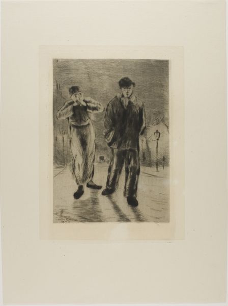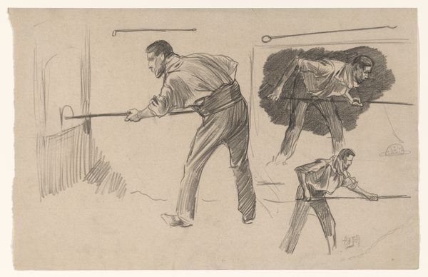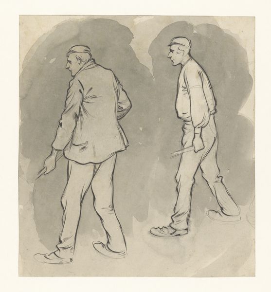 Curator: What strikes me first is the incredible economy of line. Editor: You're right. There's something starkly beautiful in that bareness, that understatement. It almost feels Japanese in its sensibility. Curator: Interesting. The piece is entitled "Twee Arbeiders," or "Two Workers," attributed to Jan de Waardt, made sometime between 1881 and 1899. It's currently held here at the Rijksmuseum. De Waardt used pencil and ink on paper to render these figures. Look closely, and you’ll see the rapid, almost restless strokes defining the forms. Editor: Restless is a good word. They're caught mid-action, wielding what looks like long poles. What do you make of their attire? The almost baggy uniformity of their work clothes seems significant, somehow. Curator: Absolutely. Clothes often symbolize more than mere practicality; they represent status, belonging, or even conformity. Here, it suggests a collective identity. These are men defined by their labor. There is nobility even in their postures as if the task imbues the body with grace despite hardship. We see such themes in much of the Realist movement where ordinary people, doing ordinary labor, become subjects for art. Editor: And it feels timeless. This isn't just about physical exertion; there is a strange stillness that seems symbolic of all working people everywhere. There's an echo of stoicism and a somber kind of strength radiating from them, wouldn’t you agree? The lack of background amplifies it—like they’re caught outside of time. Curator: The figures exist suspended, archetypal in their toil. Note the downcast eyes and slumped shoulders. This evokes pathos, inviting reflection on the human condition, its burdens, its inherent dignity despite, or perhaps because of, its struggles. I wonder, too, what their tools represent. What are they making or unmaking? Editor: I suppose that remains beautifully unanswered, allowing each of us to find a resonance within our own experiences. Curator: Indeed. A seemingly simple sketch, yet profoundly evocative of so much more than meets the eye. Editor: It’s the suggestive emptiness that gives it power, the invitation to fill in the blanks with our own narratives. Art doesn’t get much better.