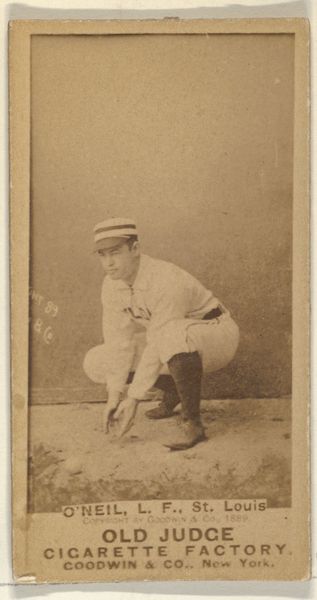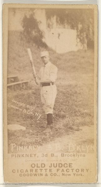 Goodwin & Company produced this photographic print of Pinkney, the 3rd Base for Brooklyn, in 1887, to be sold with Old Judge Cigarettes. The image is made by layering a negative onto photosensitive paper, then exposing it to light in order to create a positive print. The sepia tone we see here is the result of the chemicals used in the development process, and gives the image a sense of historical distance. As a mass produced consumer object, this card’s materiality speaks volumes about the industrialization of leisure in the late 19th century. The relatively thin, cheap paper stock is machine-made, reflecting the era’s burgeoning print culture and advertising industry. Consider also the labor involved: from the photographers capturing Pinkney in action, to the factory workers churning out these cards en masse. As baseball gained popularity, so did the demand for memorabilia, turning players into commodities and transforming the sport into a lucrative business. So, next time you enjoy America’s favorite pastime, remember the complex relationship between sports, industry, and visual culture.