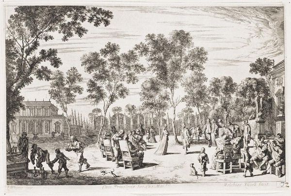 Curator: What a scene! Looking at Melchior Küsel’s "Lawn Party With Guests Watching a Ball Game," it feels like stumbling upon a secret, joyful history. It’s as if the image is holding a memory, a kind of perfect afternoon. Editor: This engraving offers a glimpse into leisure and social dynamics. The gathering itself speaks volumes about class and access to recreation, doesn't it? I wonder who’s being excluded from the lawn party. Curator: Absolutely. And look at the way the crowd frames the players. They're spectators, yes, but their presence also defines the limits of play. The artist captures the spatial politics of the game itself. Editor: Indeed. The very act of spectating, of observing and judging, reinforces the social order. It makes you think about who has the privilege to play and who is relegated to watching. Curator: But there's also an undeniable sense of freedom here. The open landscape, the activity, it suggests a world of possibilities, or at least, a temporary escape from restriction. Editor: A temporary escape for some, perhaps, but whose freedom are we really seeing represented here? It seems to celebrate privilege, inadvertently revealing the power structures at play. Curator: Perhaps. But still, the detail, the sheer delight in capturing movement, it’s infectious! Editor: That tension, between joy and critique, is where the conversation really begins.