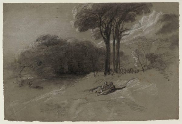 Curator: I'm struck by the subdued, almost monochromatic palette of Gainsborough's "Mountain Landscape with Pool," currently held in the Tate Collections. The charcoal and grey wash create such a pensive atmosphere. Editor: It does evoke a certain melancholic reflection, doesn't it? Gainsborough, living through the Enlightenment, was also witnessing the beginnings of industrialization. I wonder if we can view this landscape as a yearning for a pre-industrial, more "natural" past. Curator: That's a fascinating point. Considering his societal context and the politics of landscape art at the time, Gainsborough's choice to depict an idealized, untouched scene could definitely be interpreted as a subtle critique of the changing world. Editor: And perhaps a commentary on the power dynamics inherent in land ownership, accessible leisure, and social hierarchies of his era. Curator: Precisely. It becomes more than just a picturesque scene; it's an assertion of certain social and philosophical values. Editor: A somber reminder, maybe, of what's at stake when progress marches forward.