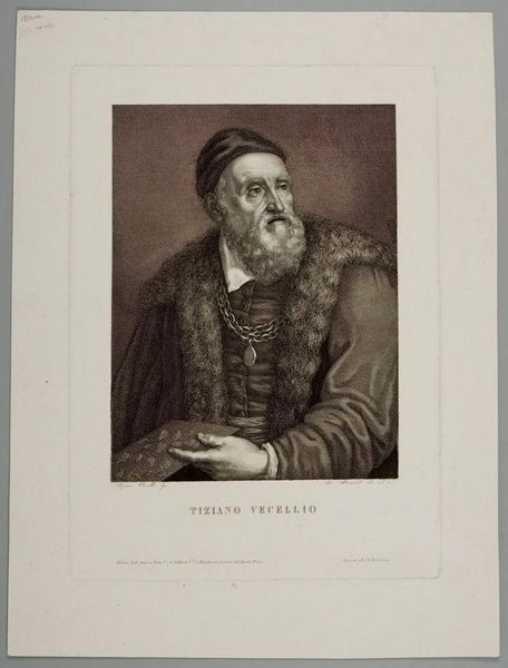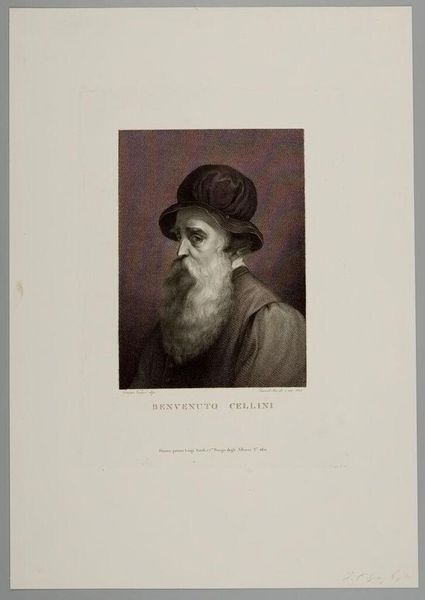 Curator: Immediately striking is the stark contrast—the sitter emerging from a darkened square, demanding attention. Editor: This is Samuele Jesi's rendering of Benvenuto Cellini, an Italian Renaissance artist. The print is currently held in the Harvard Art Museums. Curator: The image certainly romanticizes Cellini; look at the beard, almost saintly. The artist employs chiaroscuro, heightening the drama. Editor: But this idealization obscures the realities of the time. Cellini was a complex figure—his autobiography reveals much about gender, class, and violence in the 16th century. Curator: True, yet Jesi's composition remains a study in light and shadow, masterfully executed, regardless of historical context. Editor: Indeed. Both the sitter’s story, and the artistry behind the print, invite deeper contemplation. Curator: A compelling intersection of form and subject. Editor: A conversation we must continue.