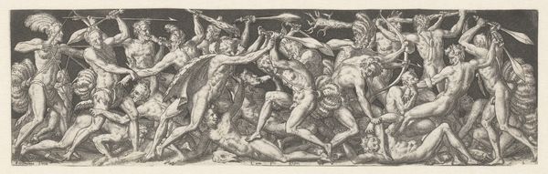 Editor: This engraving, "Laatste Oordeel (onderste plaat)", or "Last Judgement" by Cornelis Visscher, dating back to between 1638 and 1658, is a powerfully disturbing image. The swirling mass of bodies evokes chaos and suffering. What strikes you about its formal qualities? Curator: Immediately, the lack of clear spatial organization commands attention. Observe how the figures are densely packed, overlapping without a discernible background or horizon line. The artist abandoned classical notions of balanced composition. Visscher seems more interested in capturing an emotional state. What impact does this have on the viewer? Editor: It definitely amplifies the feeling of being overwhelmed. The lack of a clear focal point forces your eye to dart around, mimicking the confusion and panic suggested by the subject matter. What does the monochrome do to support that idea? Curator: Precisely. Limiting the colour palette encourages you to examine light and shadow playing across the forms, lending them plasticity. Light here doesn't describe but animates. Visscher models the bodies with intense areas of darkness, giving form to tormented physicality. Also consider the surface - the varying texture due to the engraved lines create a kinetic feeling. Would you agree? Editor: Yes, definitely. I find the overall effect both compelling and unsettling. It feels incredibly dynamic, in both form and concept. Curator: The image serves as an interesting case for Baroque engraving because Visscher manipulates line and tone to bypass the boundaries of the medium, communicating emotive and sublime states through pure formal innovation. Editor: I hadn't thought of it that way. I learned a great deal about considering texture in Baroque engraving and also about considering an artist's perspective in ignoring balance for chaos and emotions. Thanks for opening my eyes.