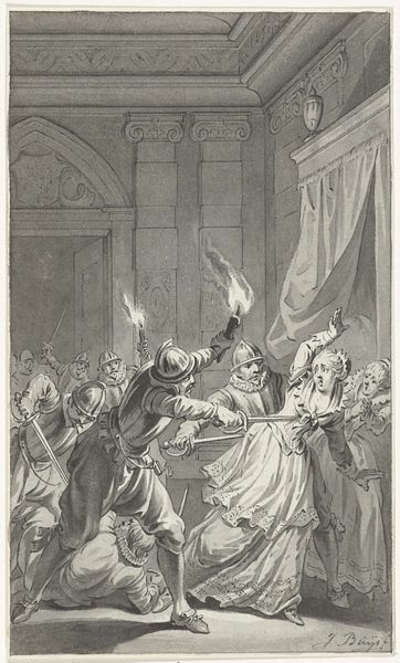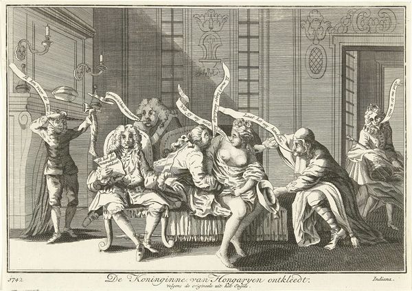 Curator: This is William Blake's "The Temple of Mirth, after Thomas Stothard," and it resides here at Tate Britain. Editor: The first thing I notice is the stark contrast between the figures in the foreground and the busts adorning the walls. There's a disjunction in scale and affect that immediately grabs my attention. Curator: Blake's engraving exists within a complex matrix of 18th-century social commentary. The Temple of Mirth becomes a site where gendered performances, class distinctions, and the very act of spectating are put on display. Editor: Yes, the composition is striking. The central figure, presumably Mirth herself, is positioned above the others, almost like a theatrical director. Semiotically, this spatial arrangement constructs a hierarchy of power and observation. Curator: Blake, deeply influenced by radical thought, uses this scene to critique the societal structures that dictate who gets to experience—or perform—joy. Editor: It's fascinating how Blake uses line and form to both depict and subtly critique the social dynamics of his time. Curator: Absolutely, and by revisiting Stothard's original, Blake infuses it with his own brand of revolutionary inquiry, offering a unique perspective on the era's cultural landscape. Editor: It makes one consider the nature of imitation and subversion, and how Blake's rendition transforms Stothard's vision into something more politically charged.