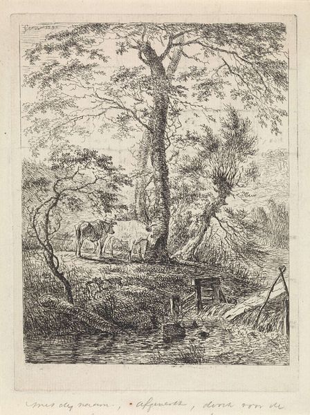 Editor: Here we have Hermanus Fock’s "Landschap met schaapsherder op heuvel," a drawing, engraving, and pencil work created sometime between 1781 and 1822. It gives off such a serene, pastoral vibe, despite being composed mostly of fine lines and simple shading. How do you read the composition of this landscape? Curator: Immediately, I'm drawn to the dominance of line. Notice how the artist meticulously employs line weight and density to create spatial depth, moving our eye from the foreground up through to the distant horizon. How would you characterize the types of line Fock employs here? Editor: Well, there's definitely a lot of very fine, almost scratchy lines to build up texture, especially in the foliage. Then, the outlines of the trees and the sheep are a bit bolder. It’s like he's building form with a series of carefully placed marks. Curator: Precisely. And consider the formal relationships created by these linear structures. See how the leaning tree in the foreground mirrors, in its diagonal orientation, the gentle slope of the hill behind it? The artist crafts visual harmony not through explicit detail, but through formal echoes and counterpoints. What impact do you think the restriction to monochrome has? Editor: It focuses attention on the forms themselves, stripped of any distractions from colour. I notice the different textures achieved are quite varied too, using hatching and cross-hatching, creating darker or lighter values. Curator: Yes, the restricted palette demands that the artist rely solely on tonal variation to suggest form, depth, and atmosphere. A crucial element of Neoclassical aesthetics lies within this. Editor: So, by focusing on the structure, Fock invites us to contemplate the balance and order within this landscape. I see now that even without the bright colors, there's such complexity just within the linework itself. Curator: Exactly. And hopefully a deeper appreciation of the formal decisions guiding its creation.