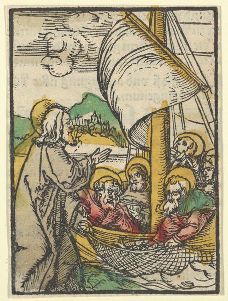 Hans Schäufelein created this woodcut, ‘Christ Calming the Storm on Lake Tiberias,’ around 1510-15. Observe how the composition is structured by a contrast between the static figure of Christ on the shore and the chaotic scene within the boat. Schäufelein uses bold lines to capture the churning water and the distressed figures struggling against the storm, the yellow of the boat pops against the muted greens and browns, enhancing the drama. The rigidity of the lines and the flattened perspective are typical of early woodcut prints. Yet, it's within these formal constraints that Schäufelein explores the semiotics of power and faith. The imbalance between the calm, controlled figure of Christ and the turmoil of the storm creates a powerful visual metaphor for divine intervention. Notice how Schäufelein uses scale to emphasize Christ's dominance, and how the cultural codes of gesture and expression amplify the narrative. This artwork challenges fixed meanings. It invites us to reflect on the nature of belief, the power of representation, and the artist's role in shaping spiritual understanding.