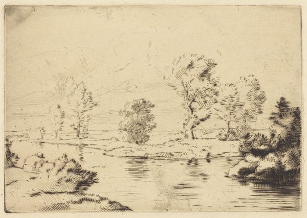 James McDougal Hart sketched this scene of a pond edge in 1850. Look at the water; the tranquil pond mirrors the natural world around it. Water, as a symbol, has long been associated with purification, renewal, and the subconscious. The still surface of the pond acts as a mirror, reflecting the trees and sky, a motif we see echoed through art history, such as in Jan van Eyck's "Arnolfini Portrait," where a mirror captures an entire scene, providing a deeper understanding of the represented reality. Water has often been interpreted as a symbol of introspection, a looking inward, reflecting on the depths of our own souls. The way Hart captures the stillness evokes a dreamlike state, inviting the viewer to delve into their own memories and emotions, engaging with the artwork on a deeply personal level. This cyclical pattern of reflection and introspection, seen across centuries, allows for continuous rebirth and reinterpretation.