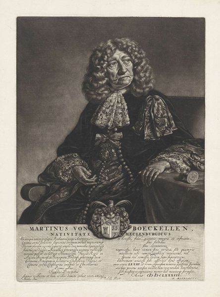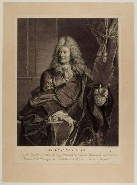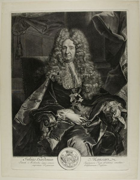 Editor: This is Gérard Edelinck’s portrait of Jules Hardouin-Mansart. The contrast between light and shadow gives it a dramatic flair. What compositional elements stand out to you? Curator: Note the interplay of textures. The velvet drapes, lace collar, and flowing wig create a rich, tactile surface. Observe how Edelinck uses line to define form and shadow, structuring the visual field. Editor: So it's about the visual language used? Curator: Precisely. The formal elements—line, texture, light—converge to create meaning. The textures speak to luxury and status, while the skillful use of light emphasizes form and character. What do you make of that heraldic emblem? Editor: It seems to further reinforce Mansart's position. I hadn't considered how much the textures contribute! Curator: Examining these choices yields a richer understanding, doesn't it?
