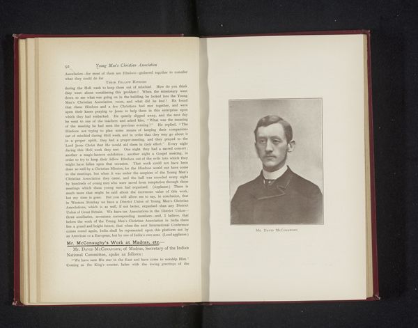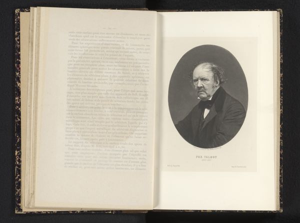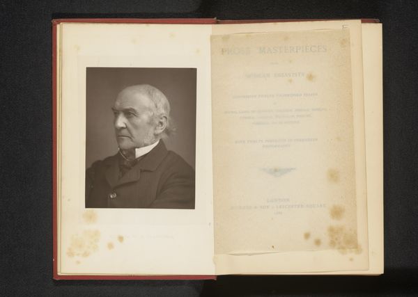 Editor: So here we have "Portret van Joseph Joesten," an albumen print from before 1892. It's presented as part of a book, alongside what appears to be a title page for sheet music. It’s interesting how this photographic print has been included as part of a bound object. How does that context inform your view of the portrait itself? Curator: This intrigues me. Albumen prints, by their nature, were mass-produced; readily available and easily reproducible. To bind it within a book elevates it. What labor processes and what social function did this "portrait" serve? Is this intended as a personal dedication of craftsmanship, a way to materialize and honor the sitter within the wider artistic community? Editor: I hadn’t considered that. It also calls into question, is this portrait more about Joesten himself, or the presentation and materiality of the print? The facing page even seems to draw focus. Curator: Exactly. How might the material and mode of production—the photographic print itself, the glue, the labor, the printing press—democratize the idea of the individual? Or is this a conscious and pointed performance of luxury that hides that very production? Editor: The mass production of the albumen print contrasts with the implied individual importance afforded to someone worthy of portraiture. What was it like to be alive at a time when image production shifted from a specialized process of painting into something almost everyone had access to? Curator: Precisely. And let's also consider the environmental impact and social dynamics involved in obtaining and processing the materials. Who benefits? Who bears the cost, and are those concerns present? Editor: Thinking about this albumen print this way really broadens its meaning. It's more than just a face; it's a product of a very specific moment in the history of technology and labor. Curator: Indeed. And in doing so, helps expose its artifice.
