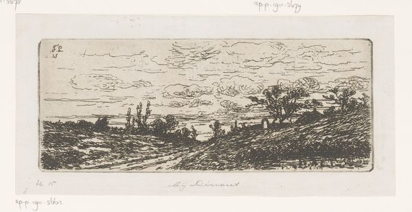 Editor: We are looking at “Pad door landschap met plassen,” or "Path through landscape with puddles," an etching by Maurits van der Valk, dating sometime between 1867 and 1931. It has a quiet, almost melancholic feel. What strikes you most about this work? Curator: I am immediately drawn to the artist’s choice of landscape. It isn't grand or sublime, like you see in much of Romantic landscape painting. Rather, it’s a common scene, an everyday space of labour. How might that reflect the cultural and political concerns of the artist and the period? Consider how industrialization and urbanization were impacting rural communities and ways of life. Does this image celebrate that community, or perhaps mourn its disappearance? Editor: It's interesting to consider the social implications of this "common scene". I hadn't thought about that. Curator: And what about the puddles? Water is often a potent symbol, often interpreted through a gendered lens in art historical discourse. What do you read from it here? Editor: Perhaps reflection and quiet contemplation? A stillness? It almost invites us to pause and observe, to consider our place within the landscape and reflect on how we are a part of it. Curator: Precisely. I encourage everyone to think about landscapes through a contemporary lens too. For example, who has access to nature? What is the impact of ecological destruction and climate change? What do you consider a "common scene" and why? Editor: That's an eye-opening point of view that I had not considered. It’s not just a pretty landscape; it is so much more complex! Thank you. Curator: You're welcome! Seeing art as a form of visual activism really opens doors to wider questions about how we negotiate culture.