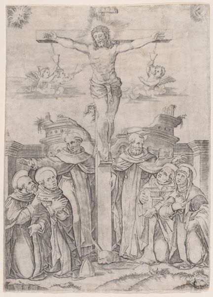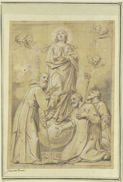 Editor: Here we have Filippo Bellini's "Virgin of Mercy," rendered in pen, ink, and charcoal on paper around 1590 to 1600. The drawing has such a gentle, reverent quality to it. How do you approach a piece like this? Curator: I am fascinated by the physicality of the piece: the paper itself, the application of the ink and charcoal, and how that relates to the social context. Think about where Bellini sourced his materials. What kind of paper was accessible, and to whom? What was the socio-economic status of those who labored to create these materials? Editor: So, looking beyond the Virgin Mary, it's also about understanding the labor and the materials involved in its production. How does that affect our reading of it as a devotional image? Curator: Absolutely! The Renaissance, despite its high-minded ideals, relied on very concrete economic systems and the availability of materials. Who could afford to commission such works, and what does the choice of a drawing—more easily reproducible than a painting—suggest about its intended audience and use? This isn’t just a heavenly vision; it’s a product of earthly endeavors. The reproductive potential afforded by the print medium would have influenced both access and cost of religious iconography in society. Editor: That makes me consider the print aspect much more deeply. Were these images widely circulated? Did that impact devotional practices? Curator: Exactly. Consider the role of prints in spreading religious ideas, challenging the dominance of painted panels only available to the wealthy, and democratizing access to images of faith, enabling personalized expressions and distributed models of devotion within their own homes, potentially disrupting conventional church practice. Editor: That's a really insightful way to re-evaluate this drawing. It connects the spiritual with the material in a way I hadn't fully considered. Curator: Indeed. Analyzing art through its material and social history opens new perspectives, transforming how we understand both its creation and its reception, and impacting the use of art as material.