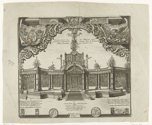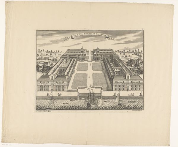 Curator: Immediately, I’m struck by this kind of quiet orderliness. It feels almost like a stage set, carefully arranged for a very particular, formal drama. Editor: That’s an interesting take! You know, we’re looking at “Governor's Palace in Lantao,” an etching, dating back to between 1644 and 1646. What grabs me is how this image portrays a site of power and perhaps hints at the socio-political dynamics in Lantao. It now resides in the Rijksmuseum collection. Curator: Well, it’s certainly doing *something* interesting with perspective, isn't it? Everything feels flattened and deliberate. And the tiny figures! They give a sense of scale but also, they seem so… removed. Almost like pieces in a game. Do you get a sense that we are deliberately separated? Editor: Absolutely. This piece offers a controlled, almost sterile, view. It subtly showcases the Dutch East India Company’s perspective. See how it emphasizes structure and governance, maybe even downplaying the messiness of daily life. The image becomes a tool for demonstrating order, even colonial power. It says "we" controlled this, and maybe were impressed by it. Curator: Power through meticulous depiction, right? Those neat rows of trees and those very precise lines. It's almost as though the artist, anonymous as they are, wanted to instill a sense of respect for the Dutch colonial authority…Or did they? Maybe they longed for a very geometric world? Editor: It's plausible. There’s an attempt to render an exotic location palatable, making it comprehensible to a European audience through recognizable artistic conventions. Notice, though, that it avoids any deep engagement with local life and focuses instead on asserting a visual claim. It becomes about what they thought and did. Curator: I find the detachment oddly compelling. The distance is not coldness but observation. This almost bird’s-eye view creates a sense of watching something significant unfold but not quite being able to touch it. Editor: Exactly. It provides a glimpse into how artistic representation shaped and supported early colonial narratives. A story in a glance, with sharp lines. Curator: So the piece becomes about the cultural landscape as much as the physical. Food for thought!