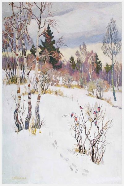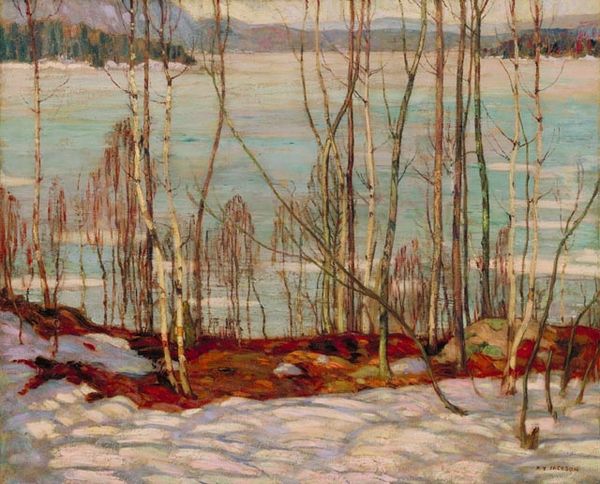 Editor: We’re looking at Eero Järnefelt’s "Kevättalven Aurinko," an oil painting done en plein-air depicting a snowy landscape. It has a serene and somewhat melancholic feel. What strikes you about this work? Curator: The landscape, particularly in the context of Finnish art around the turn of the century, often functioned as a powerful signifier of national identity and resilience. How does Järnefelt engage with or perhaps challenge this notion here? The focus on a moment of transition – "Kevättalven Aurinko" translating roughly to "Spring-Winter Sun" – feels crucial. Editor: I see the transition now. The title suggests a shift, not just winter, and the light does have a hopeful quality breaking through the snow. But what about the darker shades in the forest in the background? Curator: Exactly. Think about what the persistence of winter, despite the sun’s promise, might symbolize. The Finnish people had their own long winter of Russian oppression. Is Järnefelt subtly hinting at that ongoing struggle for autonomy and self-determination through this landscape? The style is so subtle that perhaps he aimed to create universal message through unique perspective in natural environment. Editor: That context makes the painting far more potent than just a pretty winter scene. So, nature isn't just nature here; it's a coded space reflecting socio-political realities? Curator: Precisely. The quiet beauty can also be interpreted as an act of resistance, a celebration of Finnish identity during times of adversity, and finding strength from the place. What do you think, do these circumstances impact modern readings of the work? Editor: Definitely! Knowing the historical context enriches the emotional experience and prompts us to look beyond the surface. I guess I’ve learned to never assume a landscape is *just* a landscape! Curator: Agreed. And consider how movements within the natural world echo human struggles, both on micro and macro level, which adds complexity and depth.