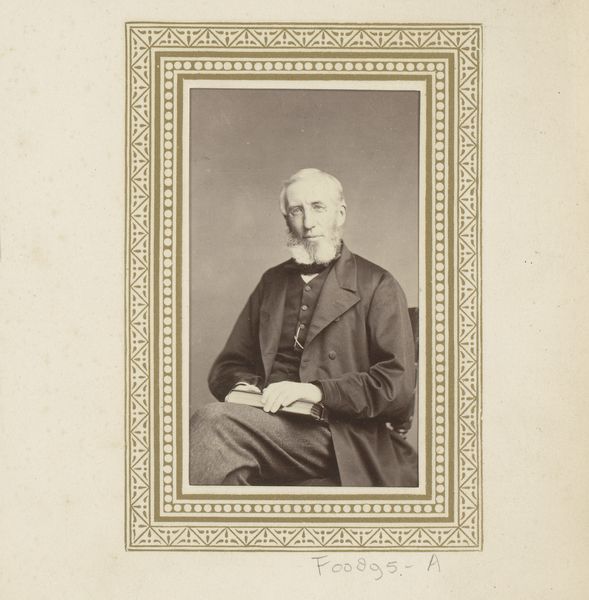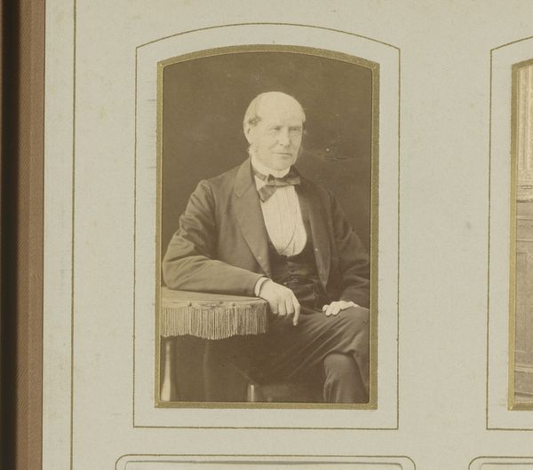 Curator: Let’s turn our attention to this portrait, "Portret van een staande man," created between 1855 and 1870 by the London School of Photography. It’s a gelatin-silver print. Editor: My first impression is one of reserved dignity, though the lighting and the subject's gaze suggest a certain introspection. You can almost feel the starch in that collar! Curator: Precisely. This was a period when photography became more accessible, influencing social perceptions of status and representation. Notice how the setting, though sparse, conveys a sense of cultivated respectability. Editor: The chair, the table draped just so... It all speaks to careful staging. You know, examining the process—the labour of setting up a portrait studio, preparing the chemicals, posing the sitter—underscores photography’s connection to industrial and class dynamics. Curator: Absolutely. Photography, as an emerging medium, democratised portraiture. It wasn't just the elite who could capture and preserve their likeness. Though the poses, often stiff and formal, reflected Victorian society's codes and conventions. Editor: Codes meant to project power. Think of the materials as signifiers—the silver, the gelatin, all mediated through the photographer's craft. Each material contributes to the image's ultimate consumption as a signifier of status. Curator: And the role of institutions like the London School of Photography cannot be overlooked; they helped shape the aesthetic values and techniques, thereby dictating which representations were deemed artistically or socially acceptable. Editor: That frame also deserves our attention, a decorative embellishment meant to elevate a commonplace technology into the realm of art. All these touches conceal photography's potential for mass reproduction, pushing it into individual, aestheticized consumption. Curator: It's an insightful reminder of how art adapts to social forces. Thank you for sharing your material perspective on this. Editor: Indeed. It enriches our understanding to consider not just what is depicted, but how, and within what structure of labor and exchange.