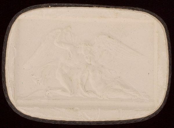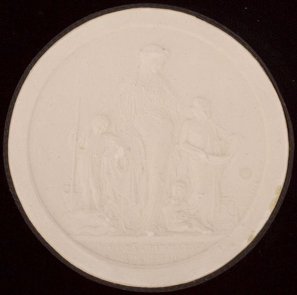 Curator: This is Giovanni Beltrami's "Virgil Reading from the Iliad in the Court of Augustus, after Wicar." Editor: It’s delicate. The monochromatic palette and low relief give it a ghostly, ethereal feel. Curator: Precisely. Beltrami, active in the late 18th and early 19th centuries, specialized in these refined, small-scale works. Think of the labor involved in its production—likely plaster or a similar material, cast from a mold, yet requiring meticulous hand-finishing. Editor: And consider the context! The scene depicts Virgil, a celebrated poet, performing for Emperor Augustus. It highlights the power of art and its role in legitimizing imperial authority. The Roman Empire's use of art as propaganda is clear. Curator: Absolutely, a classical scene reproduced on a mass-produced object. It speaks to changing attitudes toward art and accessibility. Editor: It's a fascinating interplay between high art and the burgeoning culture of reproducible images. Curator: A small object that reveals a surprisingly large history. Editor: Indeed, and prompts us to consider the endurance of both literature and power.