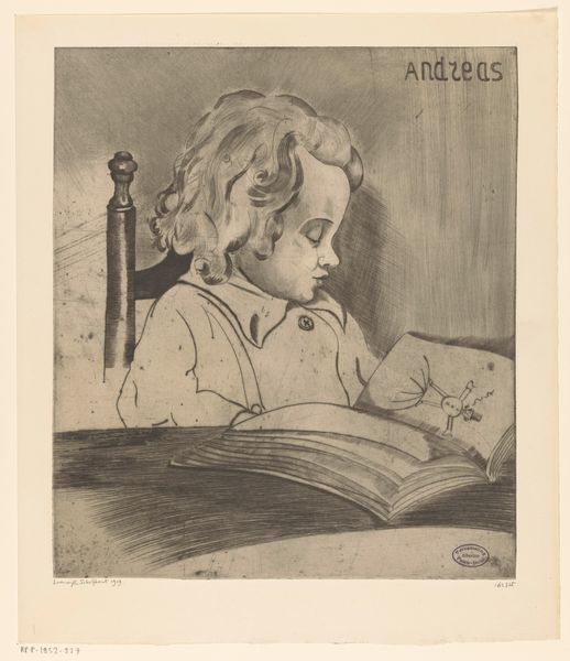 Editor: So, here we have Henri Patrice Dillon's 1893 lithograph and etching, "Drie meisjes bekijken een prentalbum"—"Three Girls Looking at a Picture Album." It's mostly shades of grey and quite muted. There's something very intimate about it; you can almost feel the quiet concentration of the girls as they share this book. What are your initial thoughts on the composition? Curator: Intriguing. Consider the composition. Dillon has meticulously structured this image around the interplay of light and shadow. Note how the diffused light delicately models the faces of the three girls, each absorbed in the act of viewing. Dillon creates depth using subtle gradations of tone. What is your opinion on Dillon’s employment of a relatively muted palette? Editor: I hadn’t really thought about it. It makes sense now that you point it out. It allows for that focus on the subtle changes in value. Do you think there’s something specific about the use of printmaking as a medium here? Curator: Yes, printmaking has significant import here. The linear precision achieved through the etching process creates a network of delicate lines, resulting in textures that articulate every element. Observe the tangible contrast between the smooth skin of the figures and the grainy texture of the album’s pages. It evokes a certain haptic quality, wouldn't you say? Editor: Yes, absolutely, now that you mention it, it brings them forward! The use of those lines helps the image not become lost in the shadows. Curator: Indeed. Through such sophisticated articulation, Dillon has constructed an image that engages with its materials with profound nuance. His compositional strategy enhances the artwork's conceptual and sensory depth. Editor: This piece is more complex than I first thought. I appreciate how breaking down the form opens new insights. Curator: And I, your insights. These close readings allow us to have more tools to articulate artistic experience.