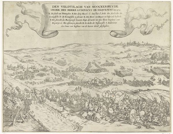 Curator: This engraving, “Derde plaat van de watersnood na dijkdoorbraken bij de grote rivieren, 1740-1741,” by Jan (II) Smit, details the aftermath of severe flooding following dike breaches in the major rivers. Editor: My first impression is the density of information! It feels overwhelming at first glance—so much text integrated with the imagery. There is almost a frenetic energy, mirroring the chaotic reality it depicts. Curator: Precisely. Smit’s work serves not just as a visual record, but also a commentary on societal response and vulnerability. The visual breakdown into sectors allows examination of individual crises of identity. Editor: Focusing on materials, you know this would've been created through a detailed, labor-intensive engraving process. Consider the time investment of the many artists who worked diligently together to produce what looks like a newsprint of sorts at the time! This points toward a specific form of historical awareness through reproducible formats accessible to those in proximity. Curator: It embodies a certain Dutch Golden Age sensibility but it doesn't quite hit the opulence one expects. There’s a practical urgency that shifts it from celebration to observation and analysis. How does the print function as a political object as a critique? How does the scale allow the working class and public accessibility, making visible and concrete the experience of collective crisis and how they affect everyday life? Editor: The distribution and subsequent consumption, and that element of craft. Do we fully account for who produces art at any given time? Were working-class creators recognized for documenting labor involved in response? Where are women depicted, both workers and experiencers? How does Smit integrate all these people as subject matter? Curator: Those are critical interventions. It shifts our view to the intersection of ecological disaster and political infrastructure, drawing out lines between power structures and individuals. Editor: In the act of both creating and analyzing, we uncover those connections as if excavating meaning within those in-betweens: labor, distribution and consumption as historical reflection... it changes everything. Curator: It calls to mind how even ostensibly descriptive art carries subjective weight and functions to empower its subject.
