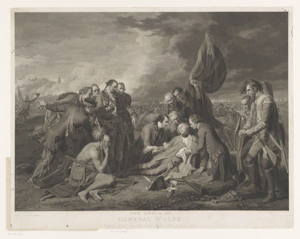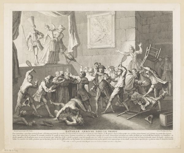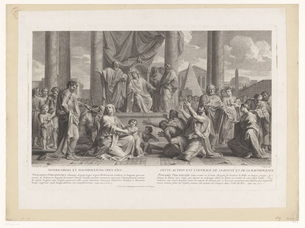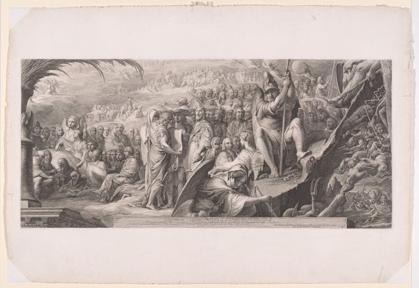 Editor: This is "Intocht van Christus in Jeruzalem," or "The Entry of Christ into Jerusalem," an engraving by Carl Federle, created between 1853 and 1859. The composition feels very staged, almost like a theatrical production. What formal qualities stand out to you? Curator: Formally, the archways create a diptych which directs the eye to the purported King enthroned on the donkey at the centre, effectively punctuating the work with this directional technique. Note the light and dark contrast, chiaroscuro, animating the figures in the foreground and creating a visual rhythm. It is not merely illustrative; Federle makes artistic choices through formal arrangement of light and line, to focus and organize space within the picture plane. How would you define the affect? Editor: I think the affect produced is, overall, idealized and celebratory; the figures are expressive, but static and balanced at once. Given that affect, does it align with the stylistic elements to be seen in Realism? Curator: Yes, and that is important. While classified under Realism, elements of Romanticism linger in the landscape and dramatic expressions of some of the figures. This creates a dialogue between the objective rendering of reality and the subjective emotional experience, evident through tonal gradations and emotive poses. This tension suggests Federle's ambition transcends mere reproduction of an event. It aspires to aesthetic significance and philosophical implications of temporality, doesn't it? Editor: That is insightful, especially with the dramatic flair. It also makes me wonder if, and how, Federle wanted his work to challenge art standards of his time. Thanks for illuminating those critical design elements and considering the affect. Curator: It has been my pleasure, such formal exercise reinforces visual sensitivity for decoding any work.
