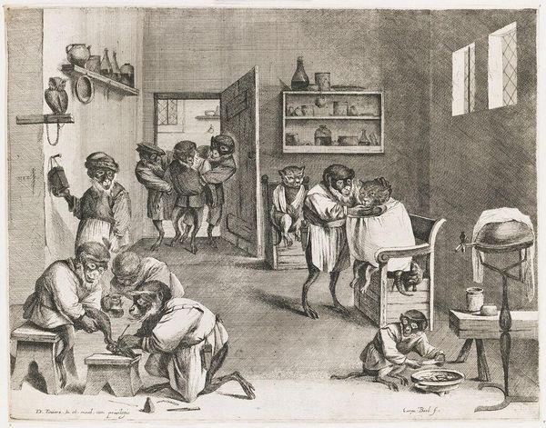 Editor: This is Vasily Vereshchagin's "Lezginka" from 1867, made as a print or engraving. It looks like it's portraying a performance. What stands out to me is the starkness of the environment depicted in this image and the attentiveness in many faces, so how do you interpret this work considering the time it was created? Curator: This piece offers a glimpse into the complex relationship between Russia and the Caucasus during the 19th century. Vereshchagin, though known for his war paintings, presents here a scene that seemingly celebrates local culture, the Lezginka being a traditional dance. However, we need to consider the power dynamics inherent in this representation. Editor: Power dynamics, how so? Curator: Think about it: this image, circulated as a print, would have reached a Russian audience, shaping their perception of the Caucasus. Was it intended as ethnographic documentation, or did it serve to reinforce Russia's civilizing mission, subtly othering the people depicted? Editor: That's a good question. The dance appears joyful, but you’re suggesting the context could alter how viewers perceive it and how Russia's socio-political motives in depicting it may reflect subtle othering, influencing the narrative about this dance for a broader Russian audience? Curator: Precisely. Who holds the power to represent whom, and for what purpose? This image, seemingly benign, operates within a larger political landscape. Also, what do you think is missing from the picture? Editor: Maybe the dancer's perspective? The viewer and Vereshchagin’s is distant. Thank you, that perspective truly helps provide more socio-political context for this image! Curator: Glad I could help. It highlights the importance of examining the cultural forces that shape how art is viewed, valued and ultimately understood.